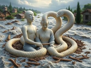 The world before Nuwa and Fuxi was chaotic, marked by floods and cosmic instability. Nuwa’s act of repairing the heavens and creating humans, combined with Fuxi’s teachings, represents the transformation of chaos into order. The five elements play a central role, as they are the building blocks of the cosmos, balanced to create a stable world. This reflects the Chinese belief in achieving harmony through the interplay of dynamic forces. In evolutionary and systems theory framings, selfless organization integrates entropy and negentropy.
