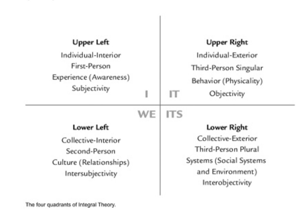 We might ask, “Why four quadrants?” “Why interior/exterior and individual/collective?” While one can think of other fundamental characteristics besides those four basic characteristics, like time and space, these four are fundamental, and it is not difficult to understand why. We can ask ourselves, “Have I ever seen an interior that didn’t have an exterior?” “Is there such a thing as an exterior that doesn’t have an interior?” “Are there individuals that are not members of collectives?” “Are there collectives that do not have individual members?”